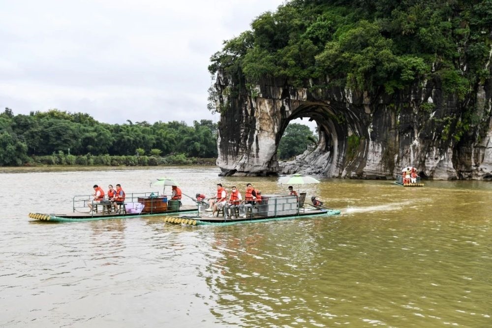 游客在廣西桂林乘坐竹筏游覽象鼻山(2022年6月29日攝) 曹祎銘攝/本刊