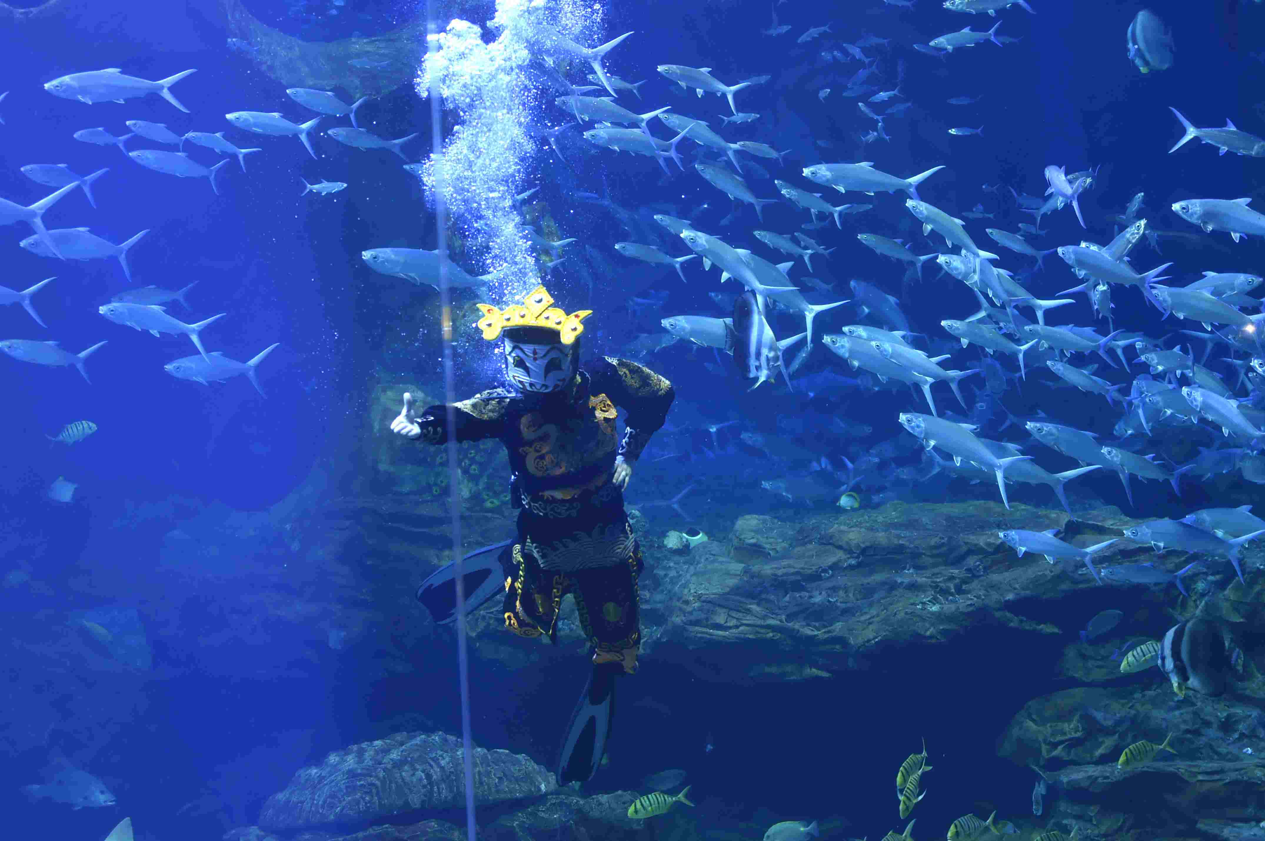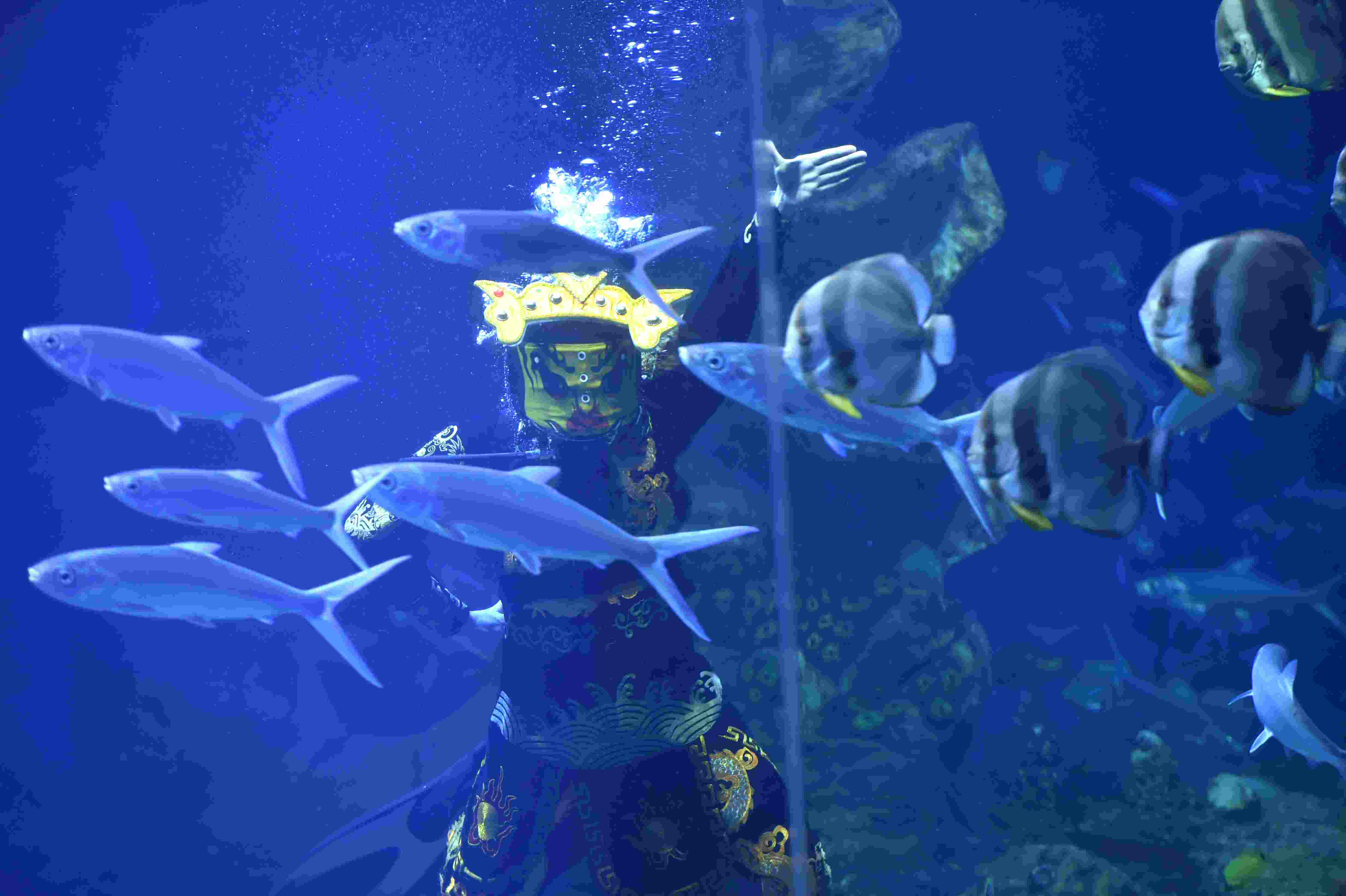2023年4月28日,演員在貴陽(yáng)市多彩貴州城極地海洋世界表演水下川劇“變臉”。