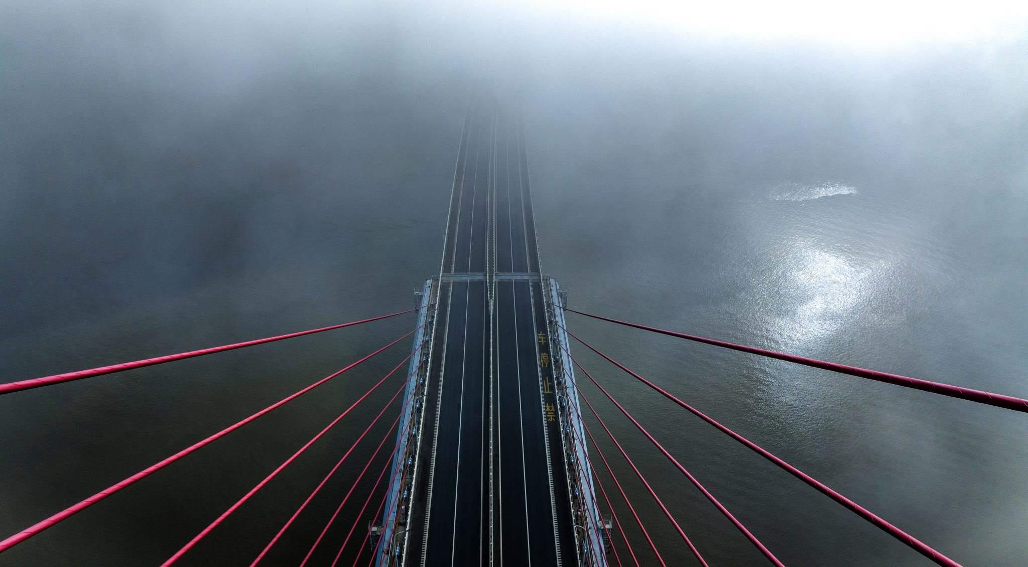 2023年4月26日,江西九江,都昌縣出現(xiàn)平流霧景觀,鄱陽湖二橋在霧中若隱若現(xiàn)。視覺中國