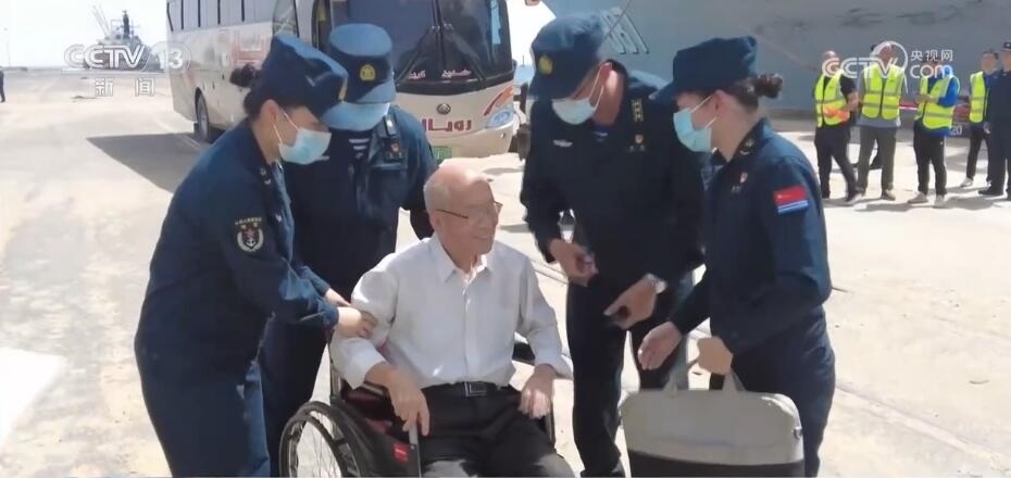 84歲的蘇丹華僑張緒富腿腳不便,接到大使館通知后,微山湖艦官兵提前準備好了輪椅。張老抵達碼頭后,官兵們用輪椅推著張老登記、安檢后,攙扶著他登上軍艦。