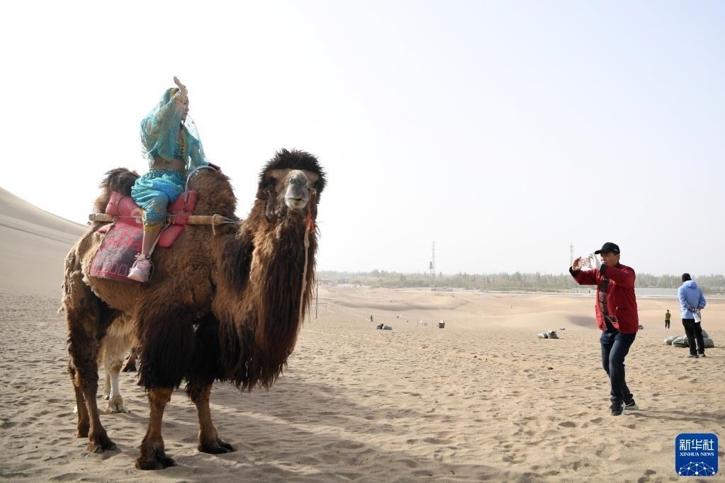 曹文華牽著駱駝在鳴沙山月牙泉景區(qū)駱駝騎乘點等待游客(4月24日攝)。