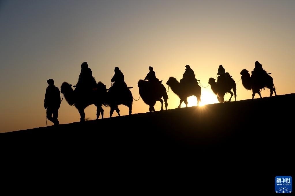 金色的鳴沙山上響起陣陣駝鈴聲,編號“414”的領(lǐng)頭駱駝和51歲的牽駝人曹文華一起帶領(lǐng)著駝隊,馱著游客,朝連綿起伏的沙丘深處走去。