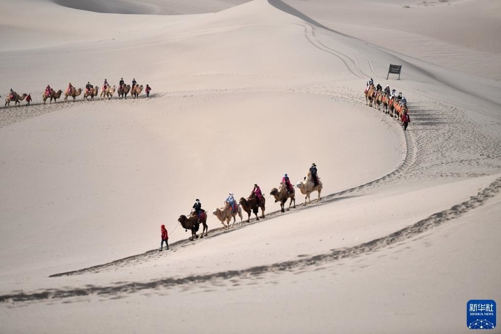 曹文華和他的駝隊載著游客行走在鳴沙山月牙泉景區(qū)的駝道上(4月24日攝)。