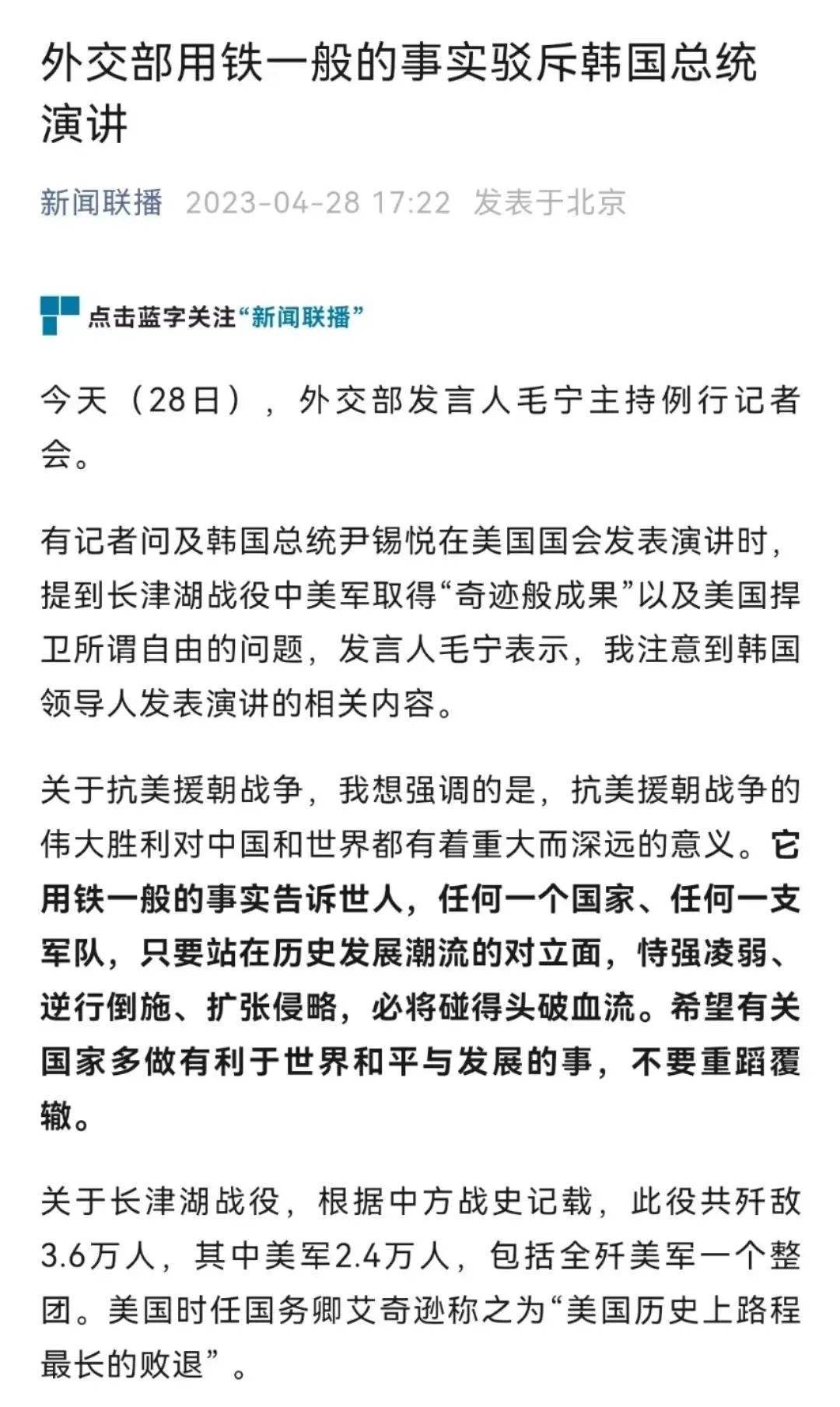 根據(jù)外媒報道,韓國總統(tǒng)4月27日在美國國會發(fā)表演講稱,美國海軍陸戰(zhàn)隊(duì)第一師在長津湖戰(zhàn)役中取得了所謂的“奇跡般成果”。