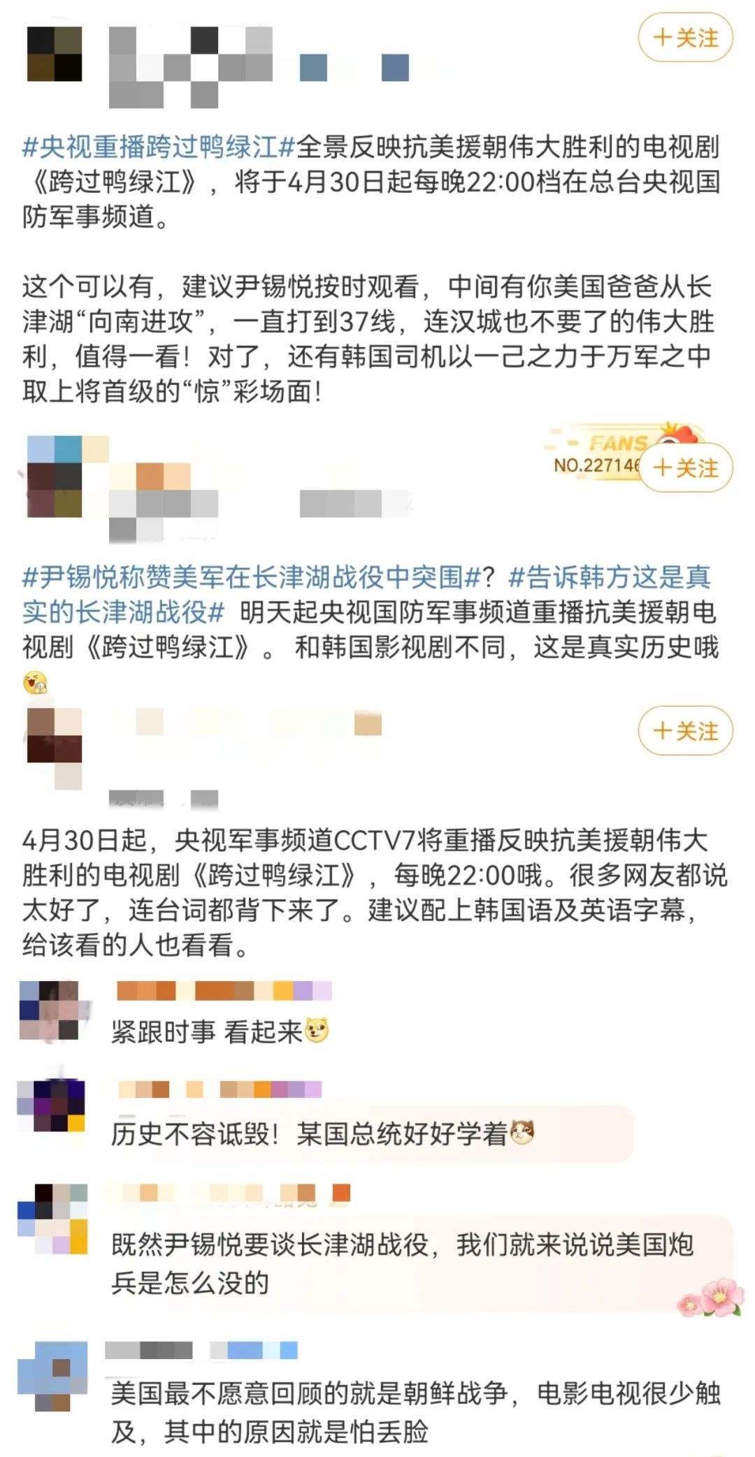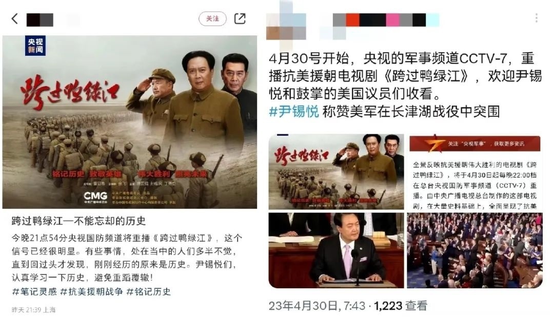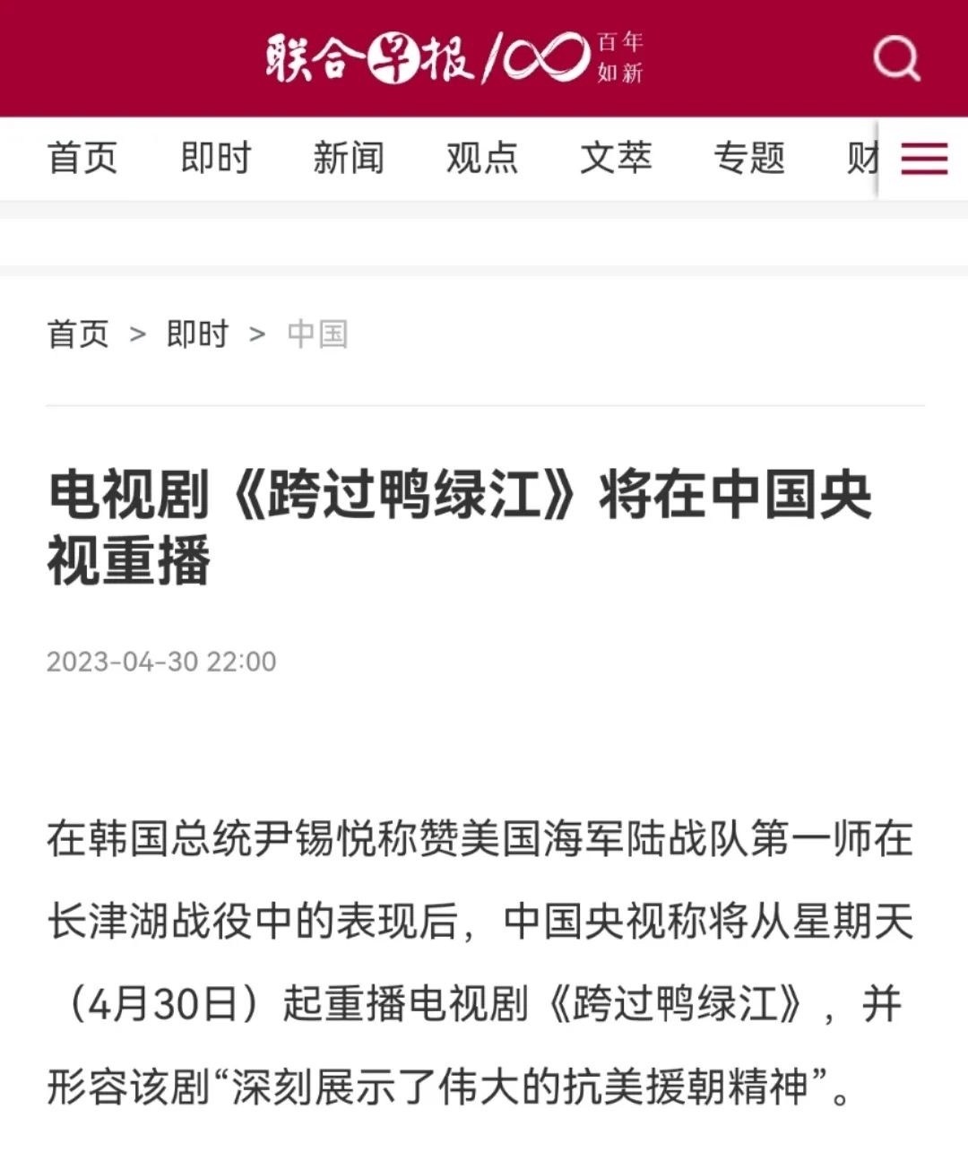 新加坡《聯(lián)合早報》更在4月30日晚10點(diǎn)準(zhǔn)時發(fā)布文章《電視劇<跨過鴨綠江>將在中國央視重播》,開篇明確重點(diǎn):在韓國總統(tǒng)稱贊美國海軍陸戰(zhàn)隊(duì)第一師在長津湖戰(zhàn)役中的表現(xiàn)后,中國央視稱將從星期天(4月30日)起重播電視劇《跨過鴨綠江》。