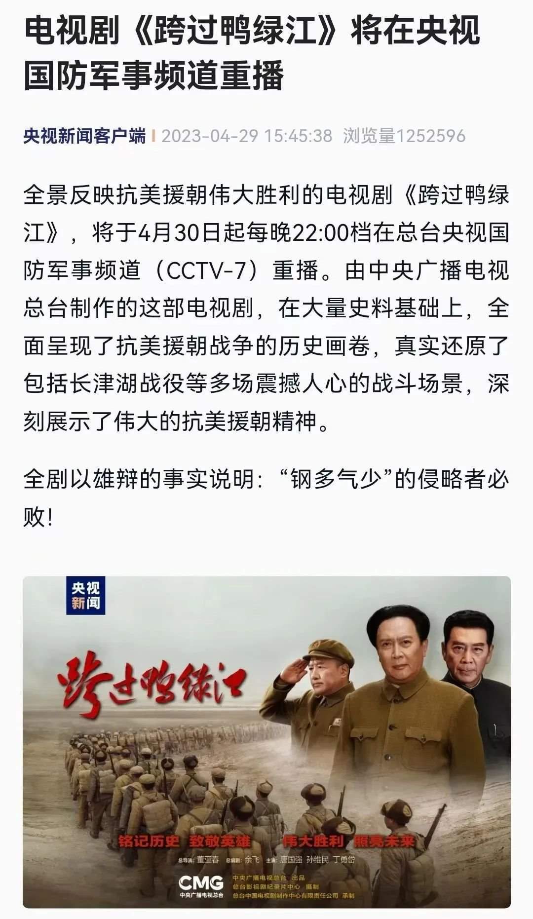4月29日,中央廣播電視總臺發(fā)布預(yù)告:電視劇《跨過鴨綠江》自4月30日起每晚22點(diǎn)檔在央視國防軍事頻道重播。