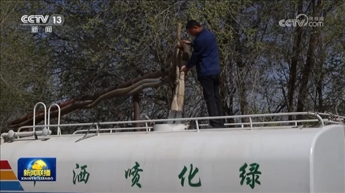 在甘肅八步沙林場,曾經(jīng)寸草不生的沙漠被嫩綠的沙生植物所覆蓋。眼下,林場職工正抓住時機,為今年新栽的樹苗澆“安苗水”。