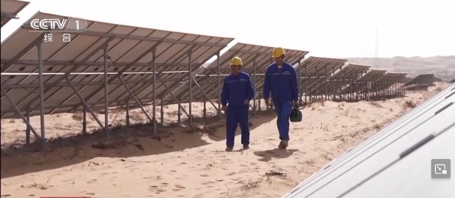 央視網(wǎng)消息:在寧夏中衛(wèi)市騰格里沙漠里,成千上萬塊藍(lán)色光伏板整齊排列,隨著太陽的運轉(zhuǎn)逐日追光,每年可以發(fā)電17億度。這里的工作人員被稱為“追日人”?!拔逡弧奔倨冢麄円廊粓允卦诠ぷ鲘徫簧?。