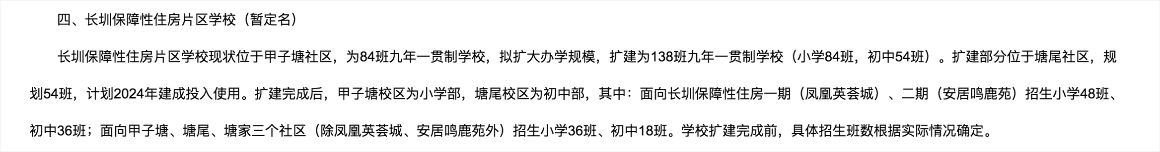 根據(jù)最新的學(xué)區(qū)劃分方案,長(zhǎng)圳保障性住房片區(qū)學(xué)?,F(xiàn)狀位于甲子塘社區(qū),為84班九年一貫制學(xué)校,擬擴(kuò)大辦學(xué)規(guī)模,擴(kuò)建為138班九年一貫制學(xué)校(小學(xué)84班,初中54班)。擴(kuò)建部分位于塘尾社區(qū),規(guī)劃54班,計(jì)劃2024年建成投入使用。擴(kuò)建完成后,甲子塘校區(qū)為小學(xué)部,塘尾校區(qū)為初中部,其中:面向長(zhǎng)圳保障性住房一期(鳳凰英薈城)、二期(安居鳴鹿苑)招生小學(xué)48班、初中36班;面向甲子塘、塘尾、塘家三個(gè)社區(qū)(除鳳凰英薈城、安居鳴鹿苑外)招生小學(xué)36班、初中18班。