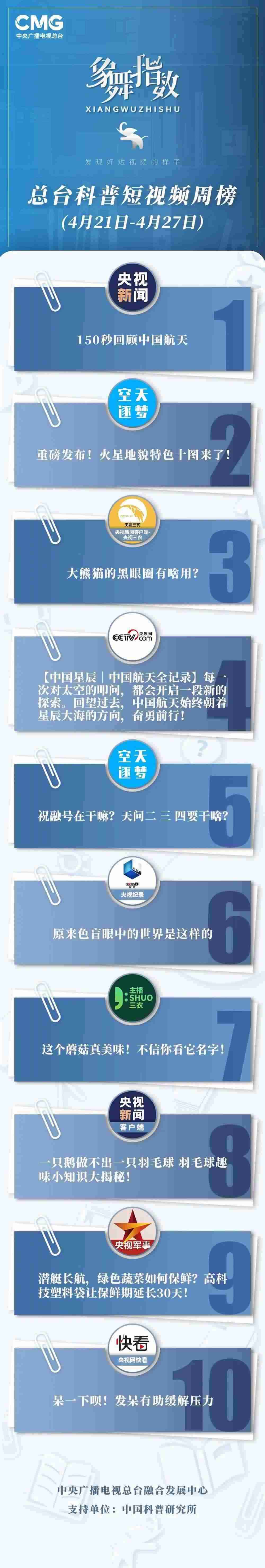 中央廣播電視總臺“象舞指數(shù)”評議品牌,推出科普短視頻周榜、總臺科普短視頻周榜。在2023年4月21日-4月27日,值得注目的內(nèi)容有: