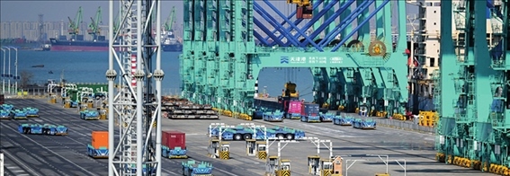 智能水平運(yùn)輸機(jī)器人在天津港全物聯(lián)網(wǎng)集裝箱碼頭作業(yè)(2023 年2月21日攝)李然攝 / 本刊
