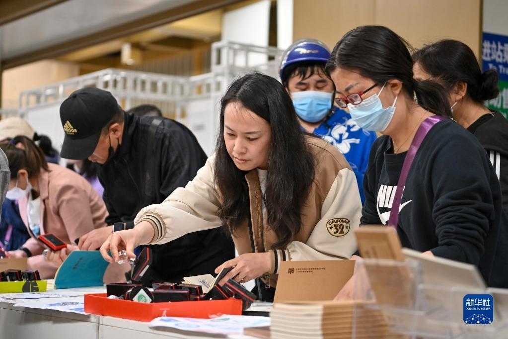 5月9日,在太原地鐵2號(hào)線大南門站,市民在第三屆“印記太原”文化創(chuàng)意設(shè)計(jì)展上體驗(yàn)古城游集章活動(dòng)。