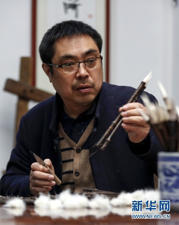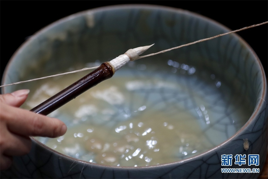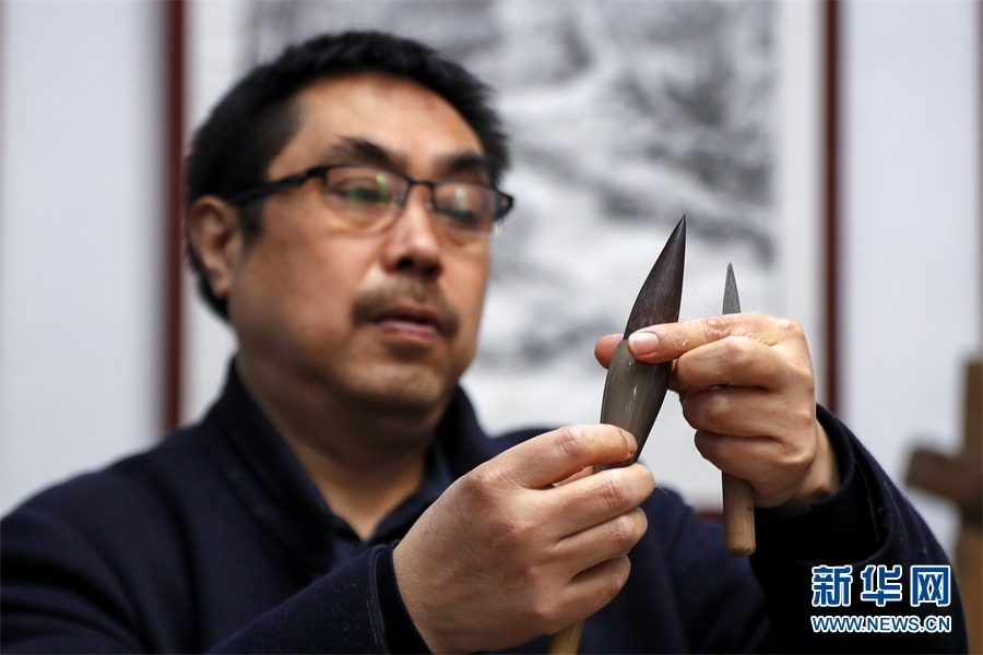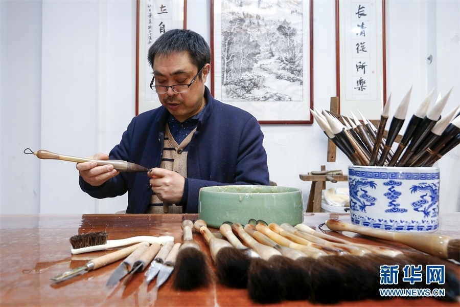 一支好的徽筆,不僅要保留傳統(tǒng)工藝,且要在原基礎(chǔ)上不斷創(chuàng)新、改良。楊文尤其重視書(shū)畫(huà)家對(duì)筆的使用反饋:“因?yàn)樗麄儗?duì)用筆最挑剔,而且現(xiàn)代書(shū)畫(huà)家創(chuàng)作方式和作品不斷創(chuàng)新,對(duì)毛筆也有新的要求,他們提出的要求我總是盡力去滿足,也使得制筆技藝進(jìn)一步得到了提高?!? 新華網(wǎng)發(fā)(施亞磊 攝)