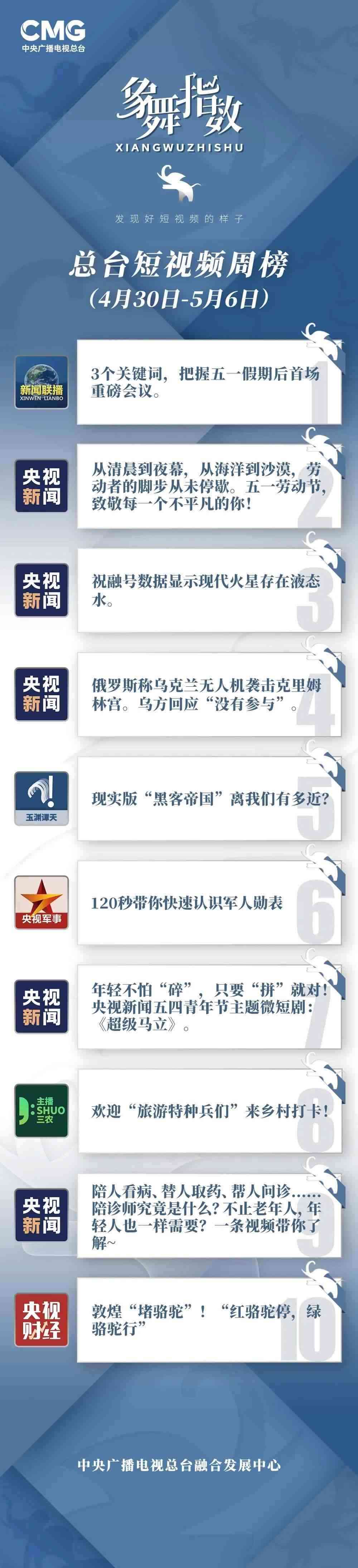 中央廣播電視總臺“象舞指數(shù)”評議品牌,推出主流媒體短視頻周榜、總臺短視頻周榜。在2023年4月30日—5月6日,這些內容引發(fā)大眾關注: