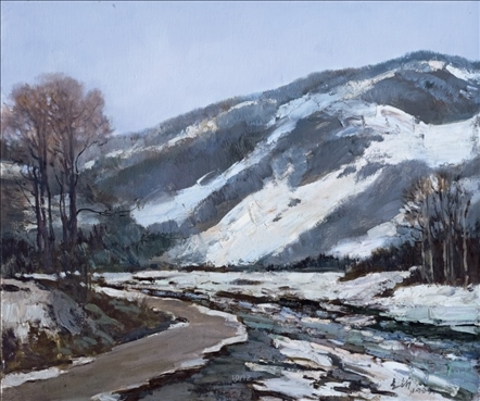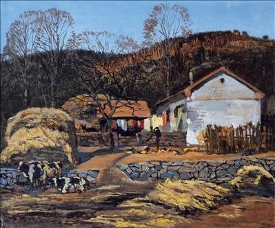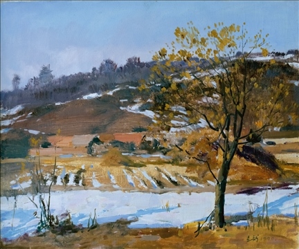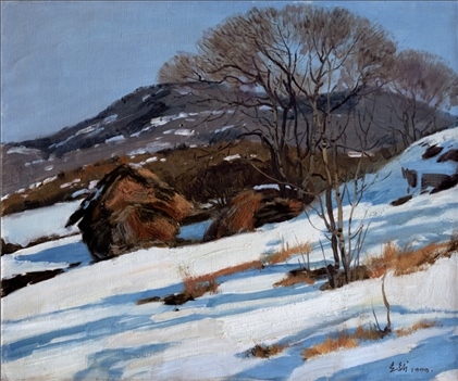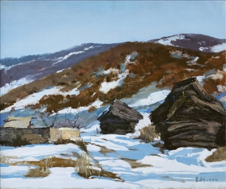《激戰(zhàn)松骨峰》描繪的是抗美援朝戰(zhàn)爭中,中國人民志愿軍與美軍激烈廝殺的悲壯場面。作者從動態(tài)型的構(gòu)圖與形象表層,把戰(zhàn)爭集團之間的搏殺以濃重的筆調(diào)展現(xiàn)開來,表現(xiàn)了中國人民志愿軍英勇頑強、熱愛自由和勇于犧牲的精神,展示了歷史的悲劇性沖突。作者從沉甸甸的歷史中找到戰(zhàn)爭中最慘烈、最殘酷、最能表現(xiàn)人物悲劇性命運的瞬間,用現(xiàn)實主義的創(chuàng)作手法,扎實、生動地塑造了一個又一個志愿軍勇士的形象。硝煙籠罩著戰(zhàn)場,鮮血與白雪融合成冰,敵我雙方,犬牙交錯,生死搏殺。同時,也使我們感受到戰(zhàn)爭的殘酷與生命的脆弱。作者處理宏大的戰(zhàn)爭場面獨具匠心:陽光透過硝煙,有節(jié)奏地營造出戰(zhàn)場的空間;雪地上被間隔的藍色陰影,反襯出黃褐色的主調(diào)。作品對細部進行了恰如其分的刻畫,但又不失對整體宏觀的把握,厚重的色彩中透出熱情,樸拙的筆觸映著畫家的激動。