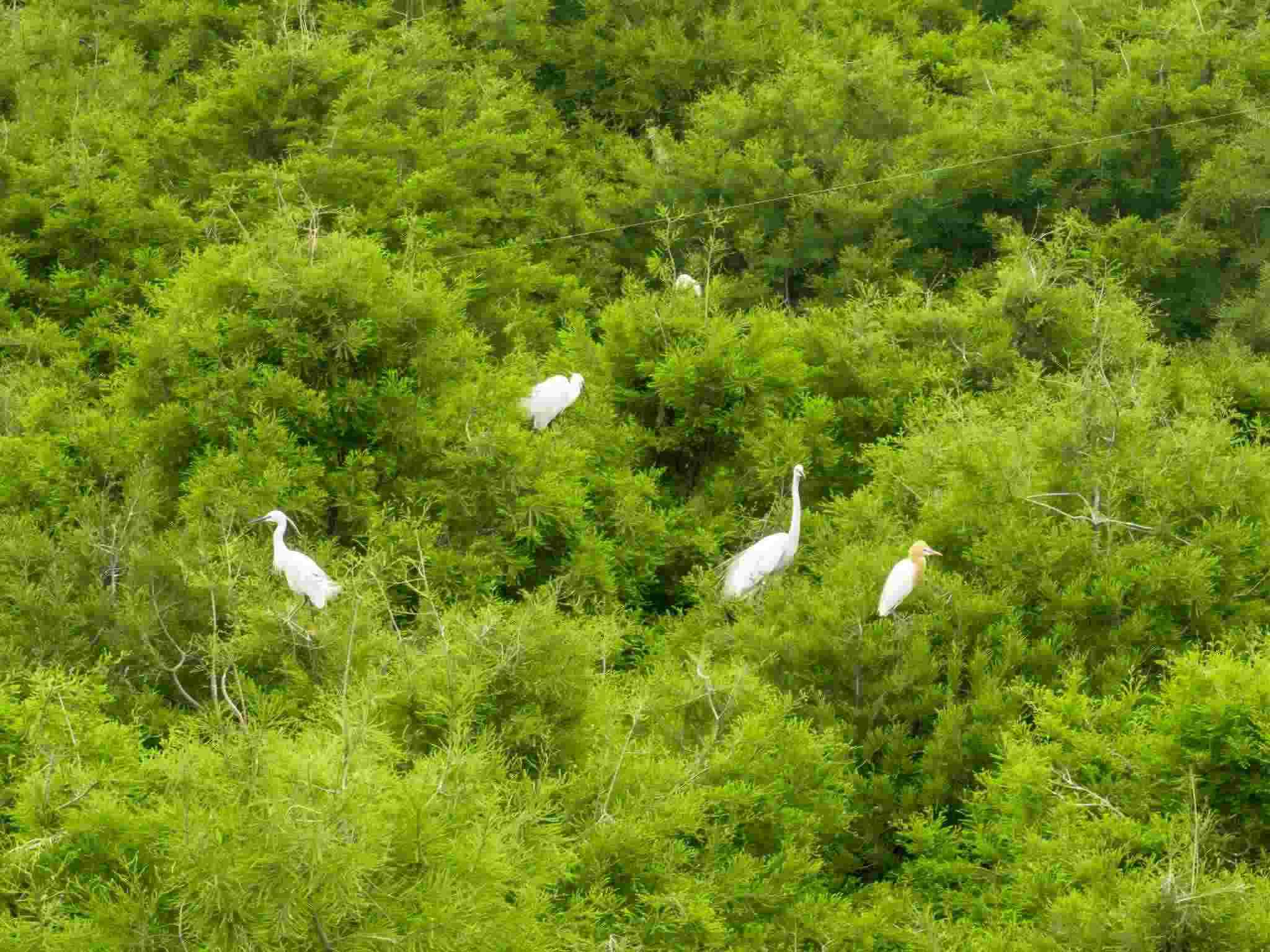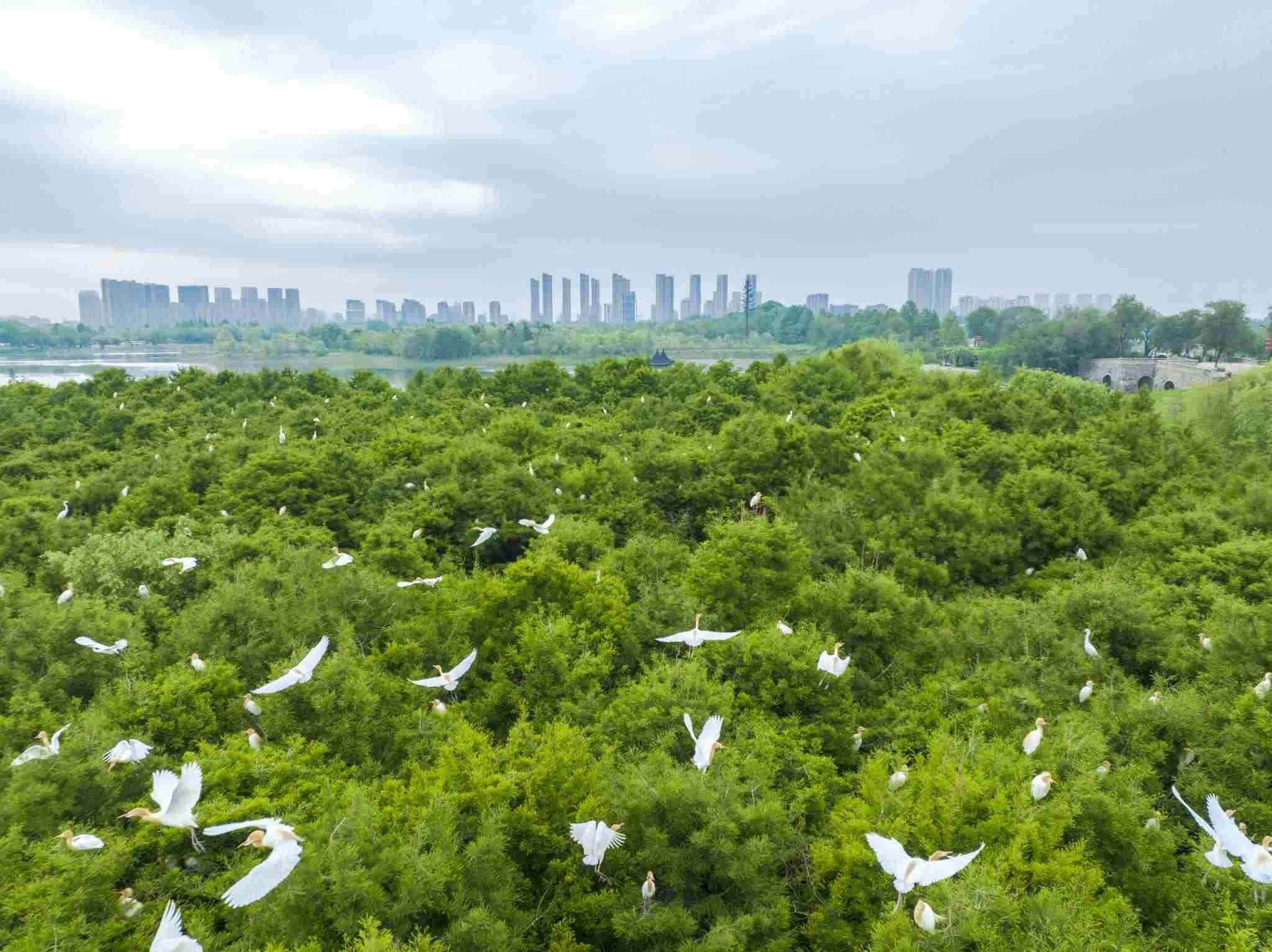 2023年5月11日,江蘇連云港,東??h西雙湖濕地公園,上千只鷺鳥(niǎo)前來(lái)?xiàng)⒎毖?。視覺(jué)中國(guó)