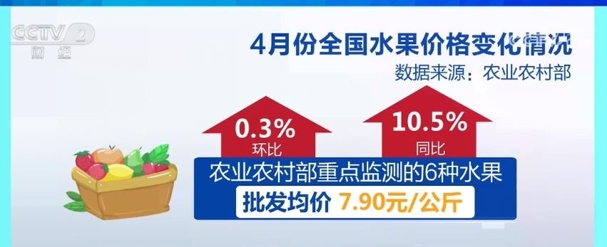 數(shù)據(jù)顯示,4月份,農(nóng)業(yè)農(nóng)村部重點(diǎn)監(jiān)測(cè)的6種水果批發(fā)均價(jià)每公斤7.90元,環(huán)比上漲0.3%,同比上漲10.5%。5月份以后,隨著天氣轉(zhuǎn)暖,南方的西瓜、甜瓜和華北、華中產(chǎn)區(qū)的櫻桃、草莓、桑葚等時(shí)令鮮果陸續(xù)進(jìn)入收獲期,水果市場(chǎng)供應(yīng)量和品種齊增。
