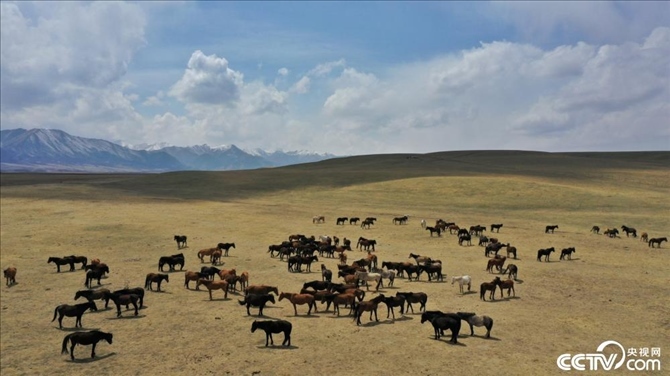 甘肅張掖,初夏時節(jié),位于祁連山下的山丹馬場積雪消融,草原開始泛綠,成群的馬匹正在吃草,一派生機(jī)勃勃的景象。