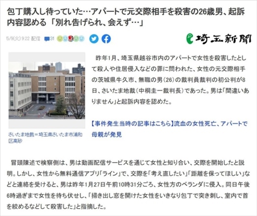 ·日本茨城縣牛久市一名26歲失業(yè)男子因不滿女友提分手,潛入女方家陽(yáng)臺(tái)蹲守近8小時(shí),等她出來(lái)收衣服時(shí)將其殺害。