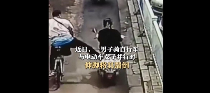 ·一男子騎自行車與一騎電動(dòng)車女子并行時(shí)伸腳將其踹倒。街道辦回應(yīng):事發(fā)后當(dāng)?shù)嘏沙鏊槿胝{(diào)查,當(dāng)事雙方已和解。