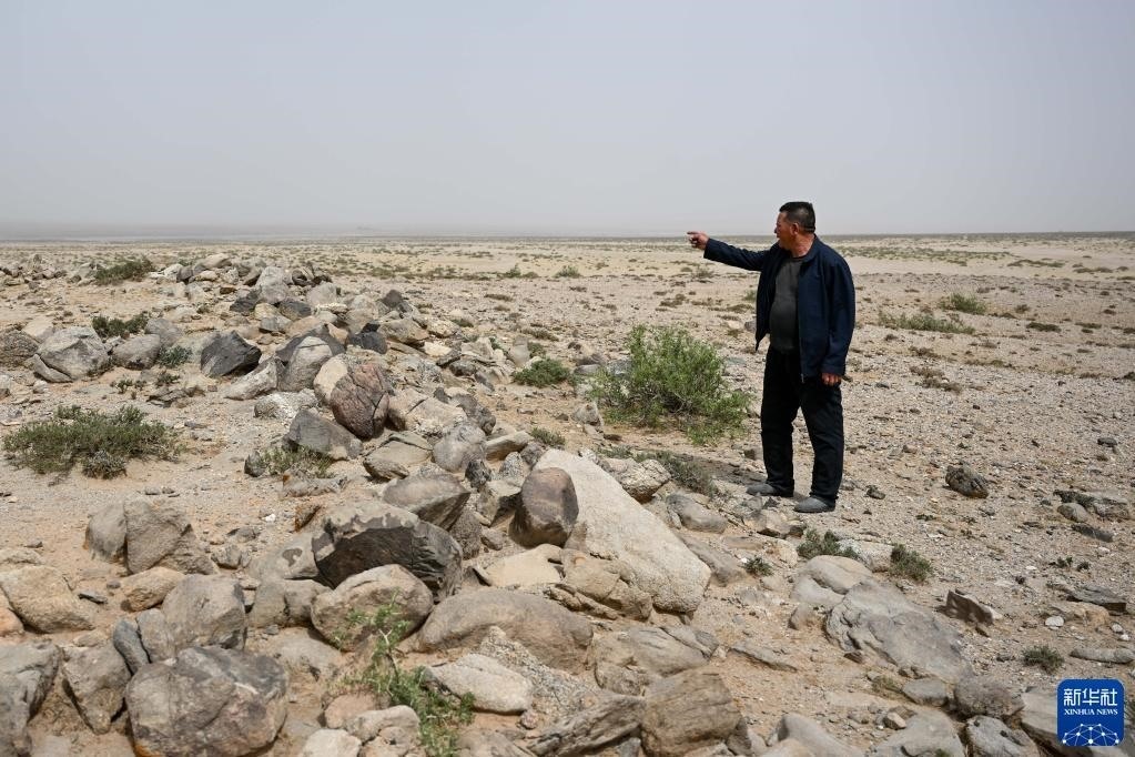 5月13日,駝峰(長城)文物保護隊員許繼龍在巡查阿拉善左旗一處石圈遺址。