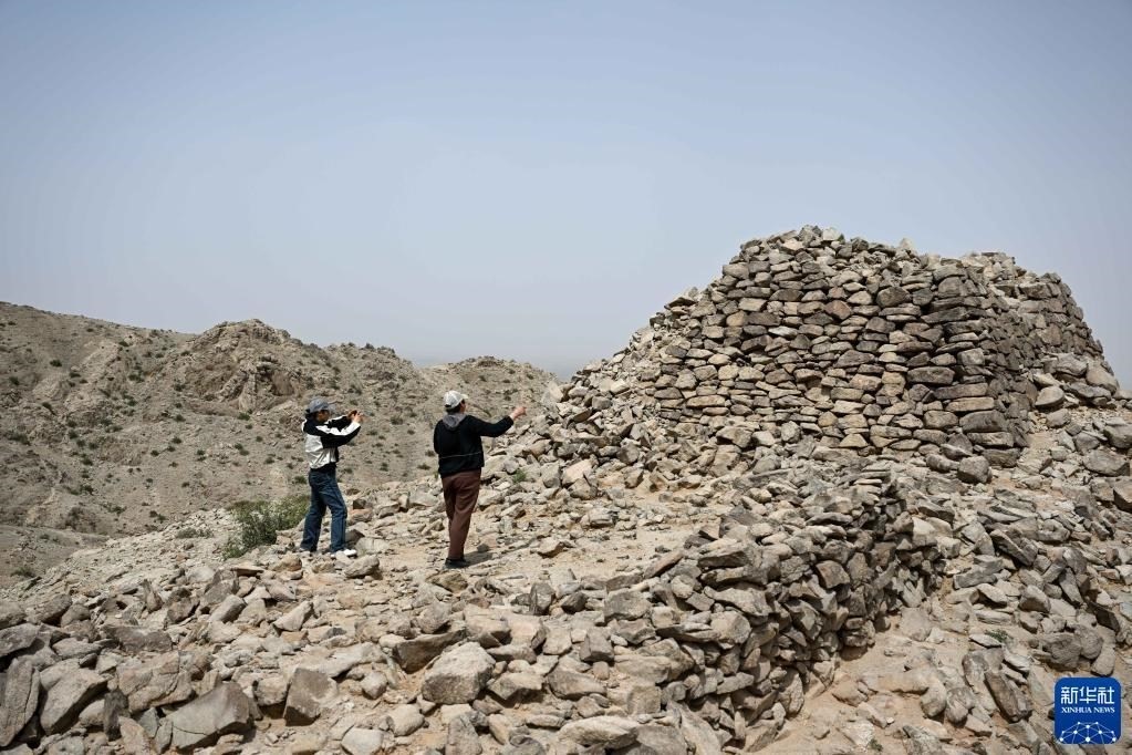 5月13日,駝峰(長城)文物保護隊員許繼龍(右)和烏仁其其格在巡查阿拉善左旗一處石圈遺址。