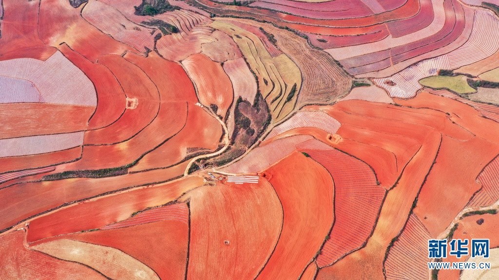 云南省尋甸回族彝族自治縣,連綿不斷的旱梯田遍布山間,遠(yuǎn)接天邊,每年4-5月,經(jīng)過村民翻新、平整后的紅褐色土地,從空中俯瞰五彩斑斕、蔚為壯觀。當(dāng)?shù)卮迕裥燎诟旁诜饰值募t土地上,用勤勞的雙手,繪就一幅幅勞動(dòng)藝術(shù)畫作。新華網(wǎng)發(fā)(孫文來 攝影報(bào)道)