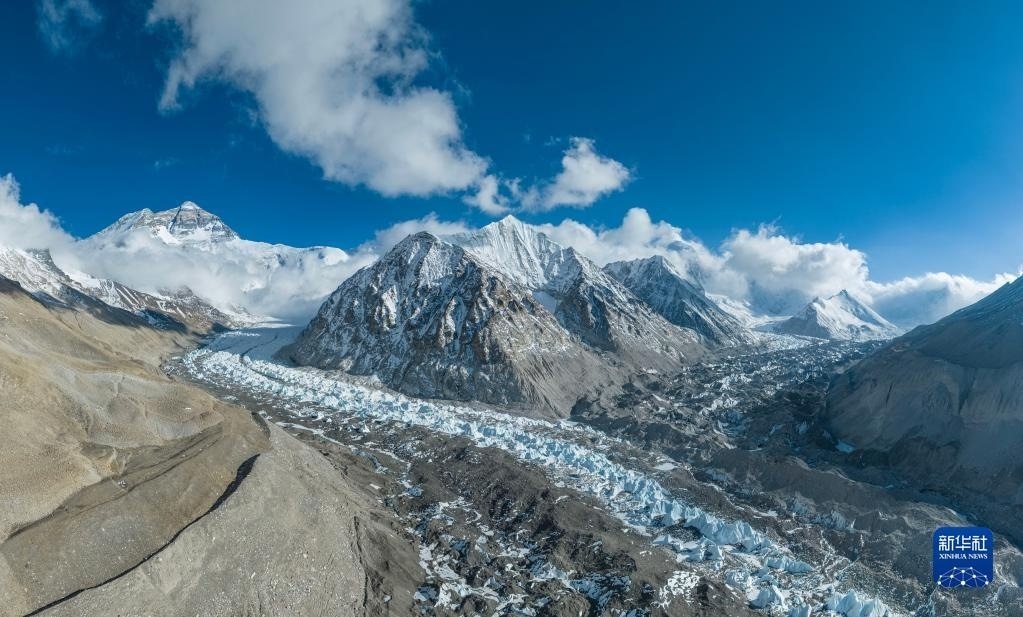 這是珠峰腳下的中絨布冰川(前)和西絨布冰川(后)(5月15日攝,無人機(jī)照片)。