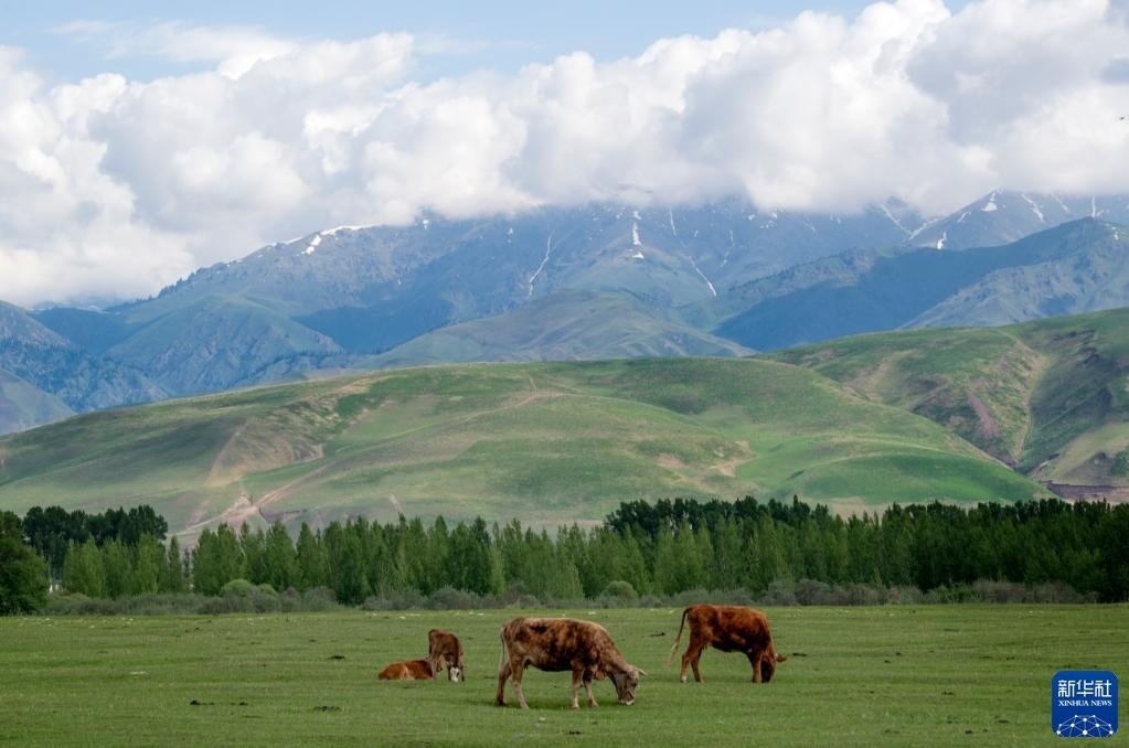 5月20日,在那拉提草原上,幾頭牛在吃草。