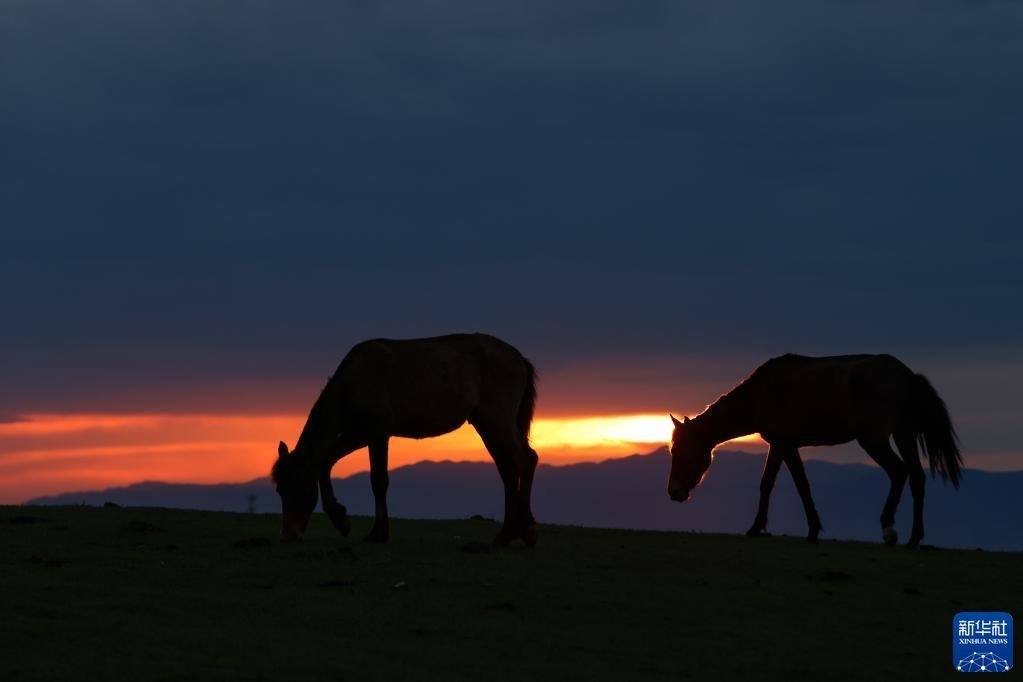 5月20日,夕陽下的那拉提草原上,馬在吃草。
