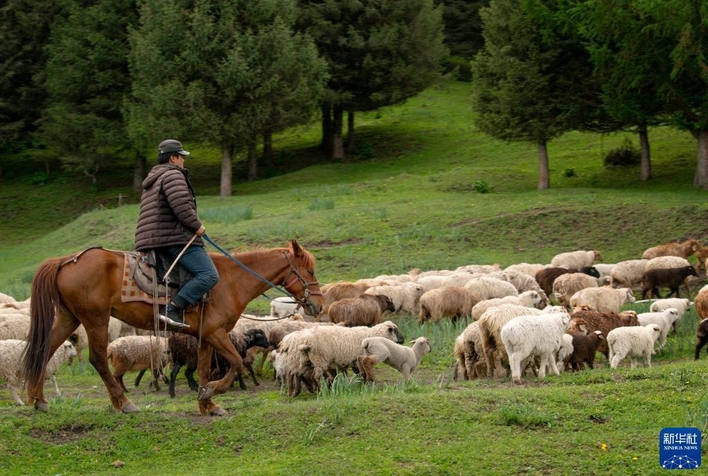 5月20日,在那拉提草原上,牧民在放牧。