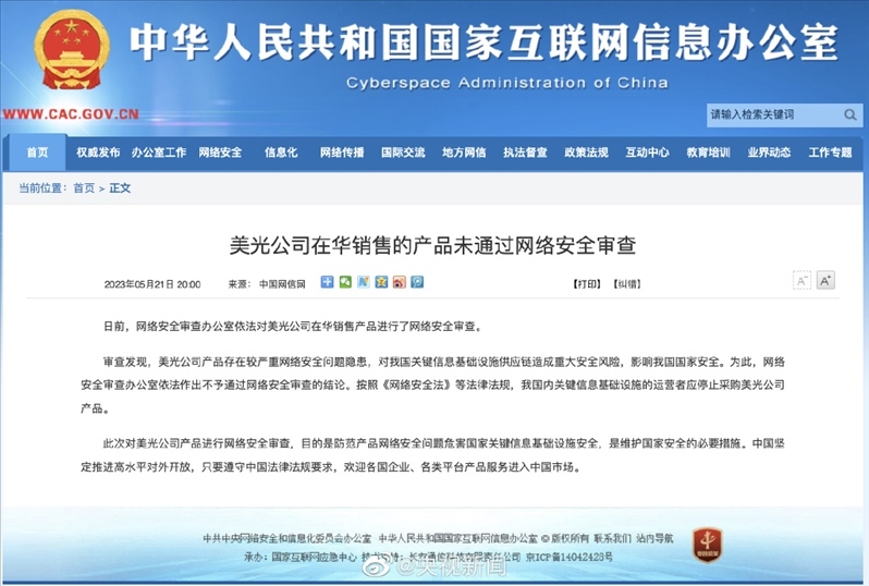 ·影響我國國家安全,美光公司在華銷售的產品未通過網(wǎng)絡安全審查。按照《網(wǎng)絡安全法》等法律法規(guī),我國內關鍵信息基礎設施的運營者應停止采購美光公司產品。