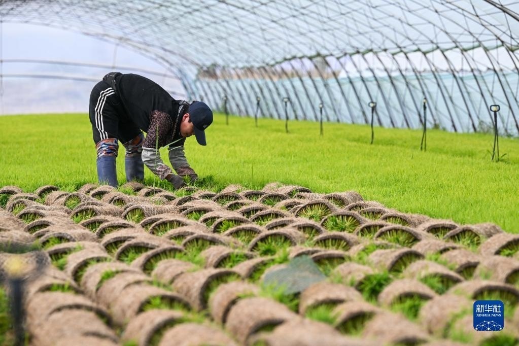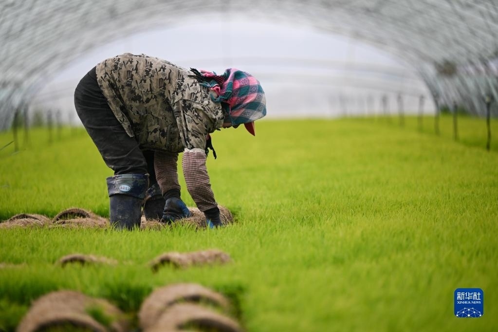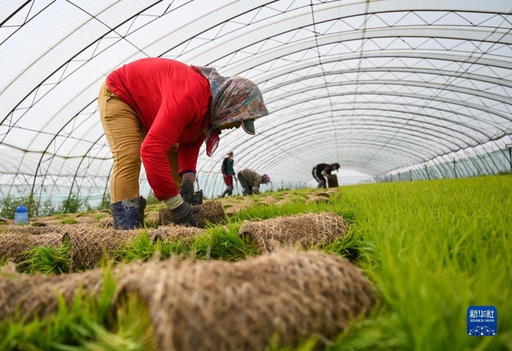 5月23日,達拉特旗昭君鎮(zhèn)村民在育秧苗大棚中起秧。