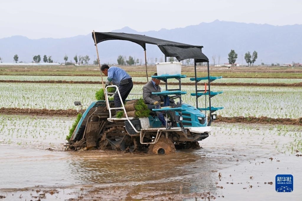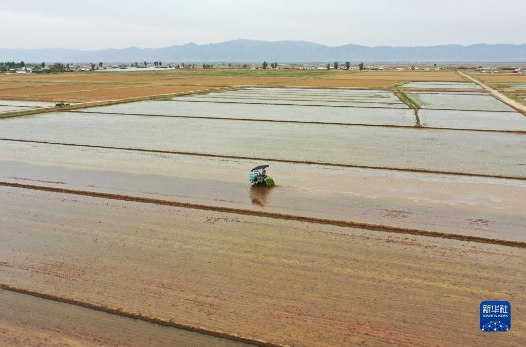 5月23日,達拉特旗昭君鎮(zhèn)村民在鹽堿地改良水稻田中使用農(nóng)機插秧。