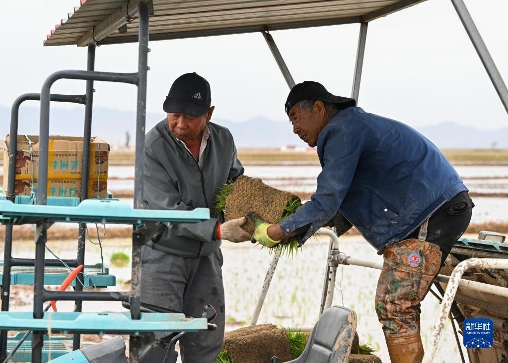 5月23日,達拉特旗昭君鎮(zhèn)村民在為農(nóng)機添加秧苗。