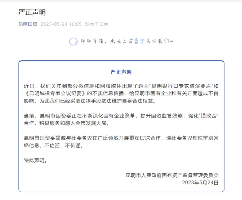 ·昆明市國(guó)資委發(fā)布聲明,“昆明銀行口專家路演要點(diǎn)”和《昆明城投專家會(huì)議紀(jì)要》不實(shí)。