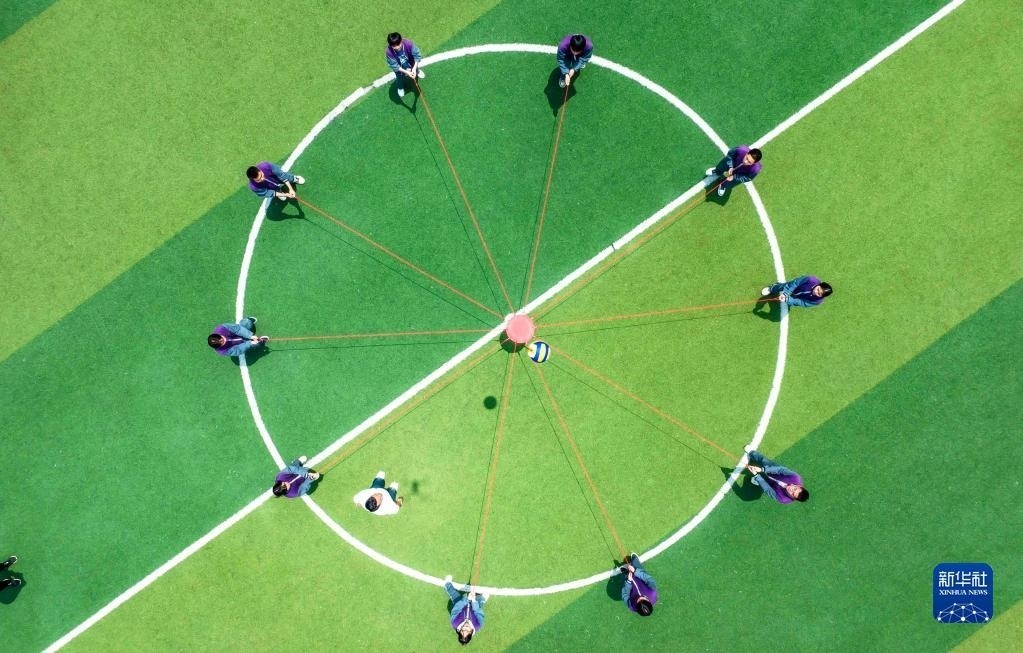 5月24日,貴州省黔西市樹立中學(xué)高三學(xué)生參加“同心擊鼓”游戲釋放壓力(無(wú)人機(jī)照片)。