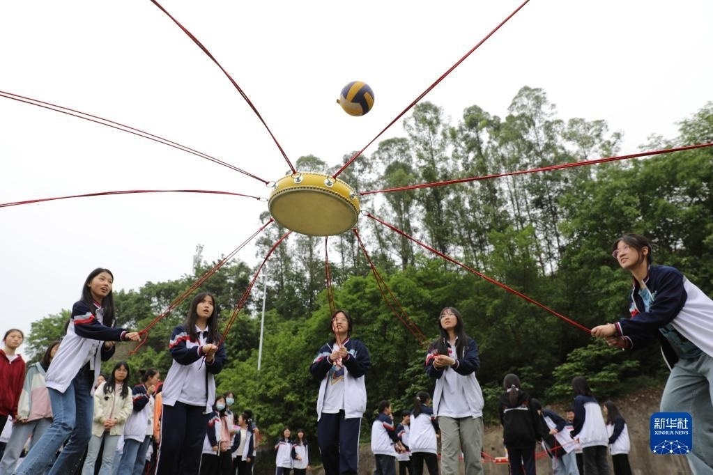 5月23日,四川省廣安市武勝中學(xué)高三學(xué)生開展“同心擊鼓”心理調(diào)適趣味游戲活動(dòng)。