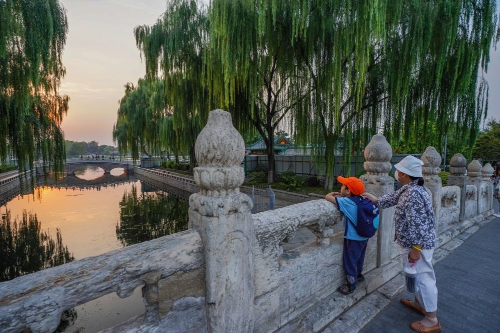 市民在京杭大運河和北京中軸線交匯點的萬寧橋上眺望什剎海(2022年9月28日攝)。新華社記者 陳鐘昊 攝