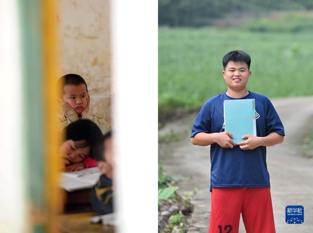 拼版照片:左圖為2012年7月4日,在大化瑤族自治縣板升鄉(xiāng)弄勇小學,7歲的蒙錦晨在課堂上;右圖為2023年1月25日,在大化瑤族自治縣板升鄉(xiāng)弄勇村,正在浙江省臺州職業(yè)技術(shù)學院讀大一的蒙錦晨寒假回家時在村中留影。 新華社記者 黃孝邦 攝