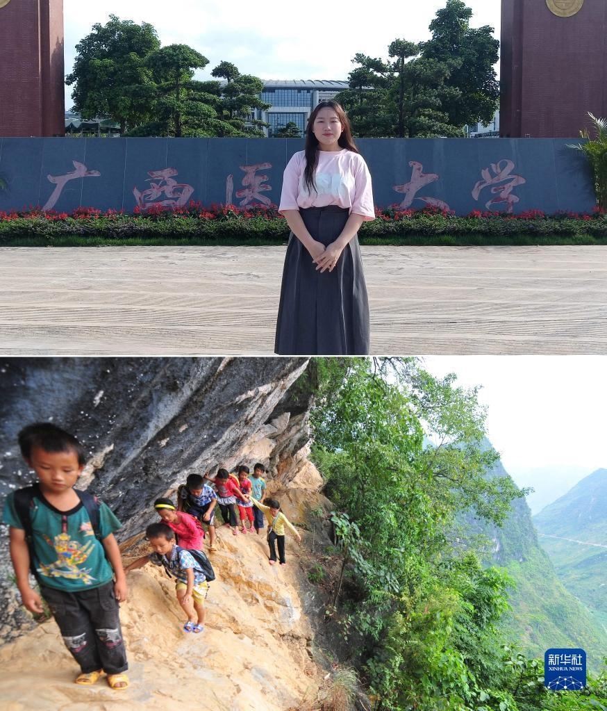 拼版照片:上圖為2023年5月27日,22歲的蒙秋艷站在她就讀的廣西醫(yī)科大學校門口(新華社發(fā));下圖為2012年9月3日,在大化瑤族自治縣板升鄉(xiāng)弄雷村哈保屯,11歲的蒙秋艷(右一)在懸崖邊護著低年級的小伙伴回家(新華社記者黃孝邦攝)。2021年,蒙秋艷以優(yōu)異的成績,考取廣西醫(yī)科大學。