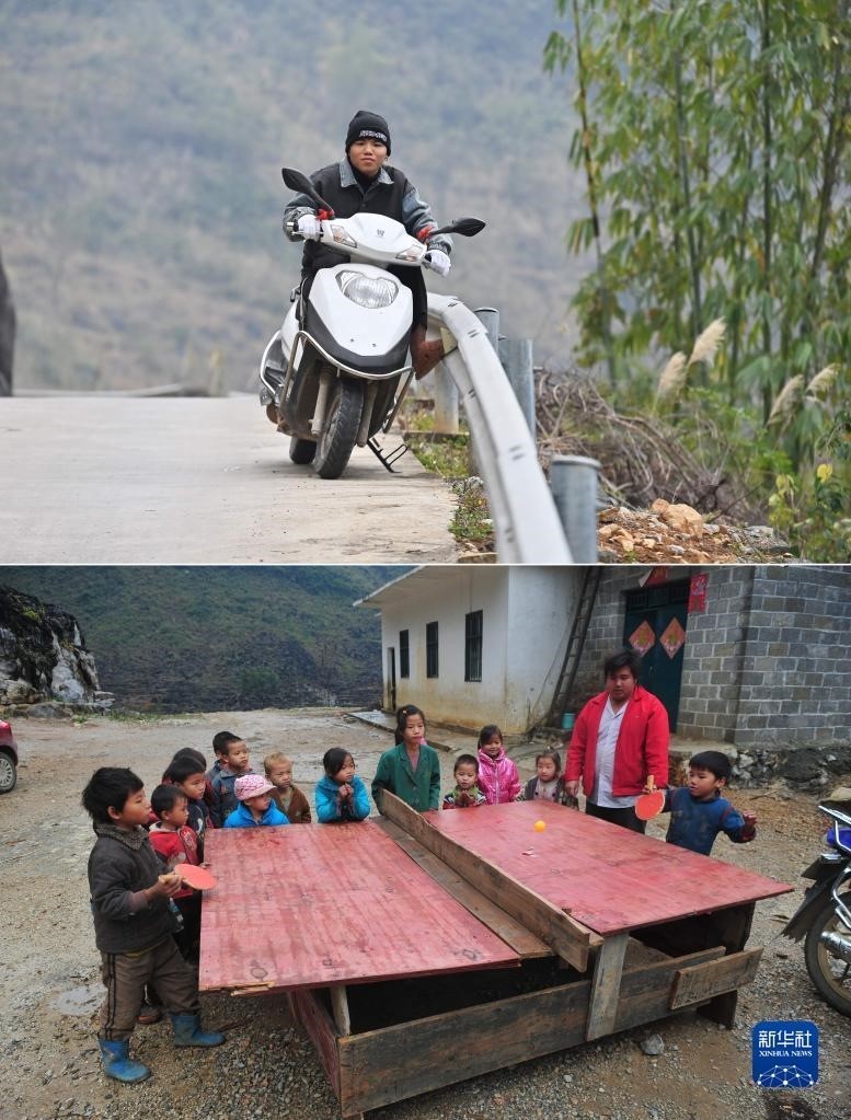 拼版照片:上圖為2023年1月26日,在大化瑤族自治縣板升鄉(xiāng)弄勇村,在廣東工作、返鄉(xiāng)過年的蒙宣海在路邊休息;下圖為2012年12月27日,在弄勇村弄頂教學點,7歲的蒙宣海(右一)在打乒乓球。2022年,蒙宣海技校畢業(yè)后,選擇去廣東工作。
