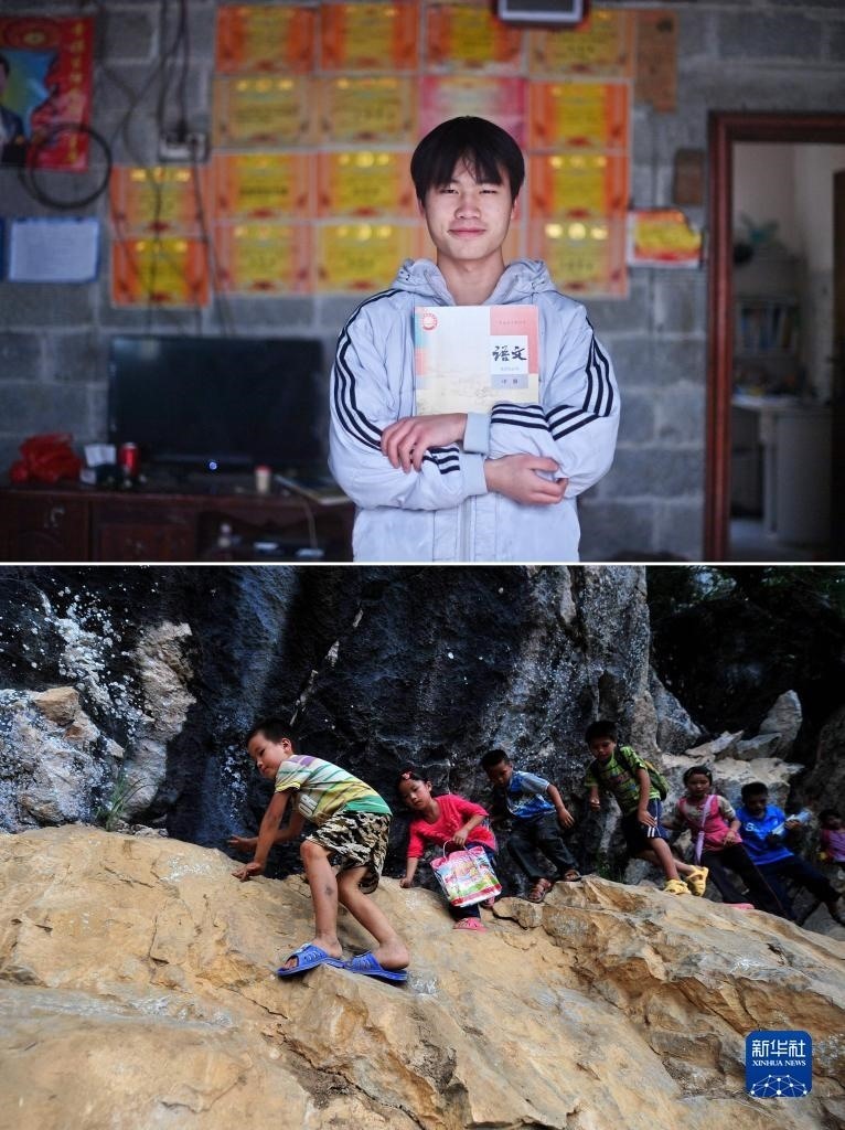 拼版照片:上圖為2023年1月26日,在大化瑤族自治縣板升鄉(xiāng)弄雷村,大化瑤族自治縣高級中學高二學生蒙文超站在家里,身后的墻上貼滿獎狀;下圖為2012年9月5日,在大化瑤族自治縣板升鄉(xiāng)弄雷村,7歲的蒙文超(左一)放學后爬懸崖回家。今年18歲的蒙文超最大的夢想是一年后考上理想的大學。