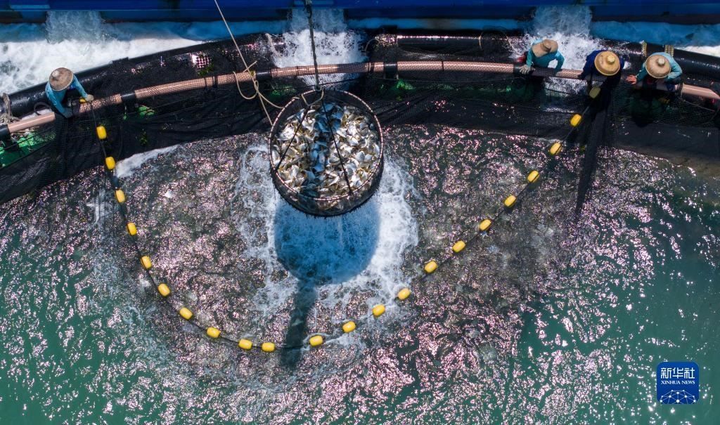 5月27日,在湛江市徐聞縣西連鎮(zhèn),漁業(yè)工人從徐聞國橋深海養(yǎng)殖有限公司的金鯧魚深海網(wǎng)箱捕魚(無人機照片)。