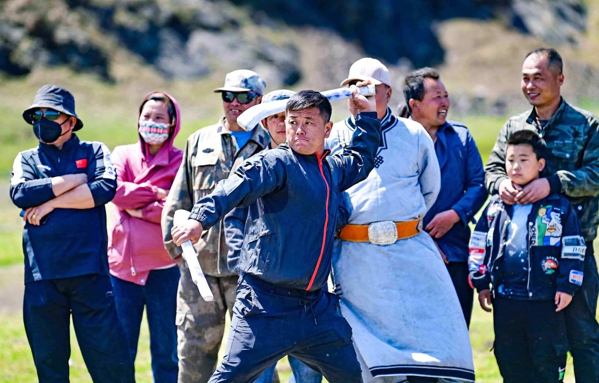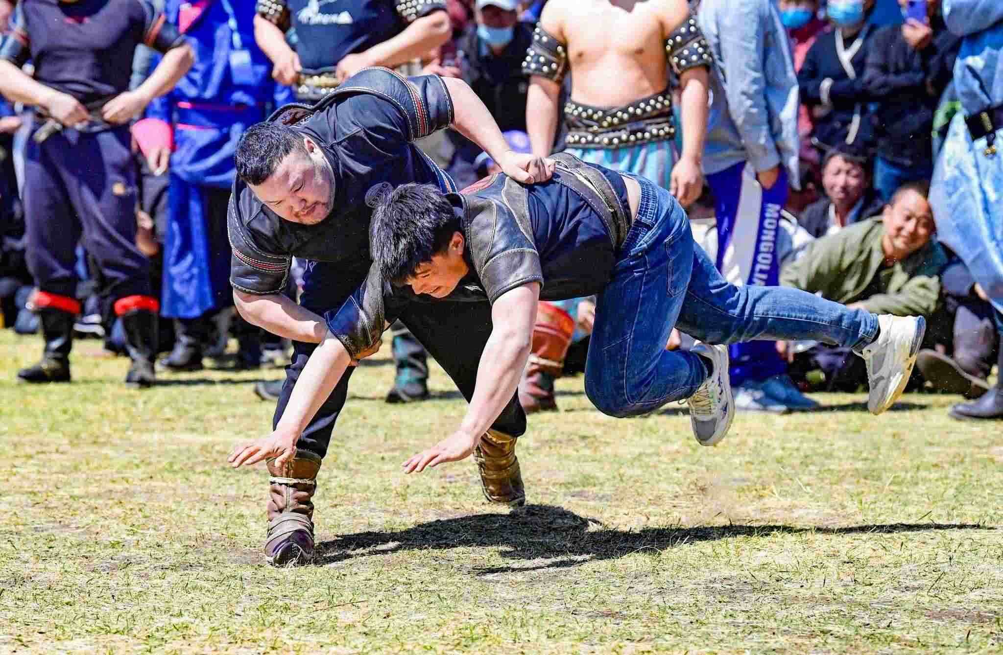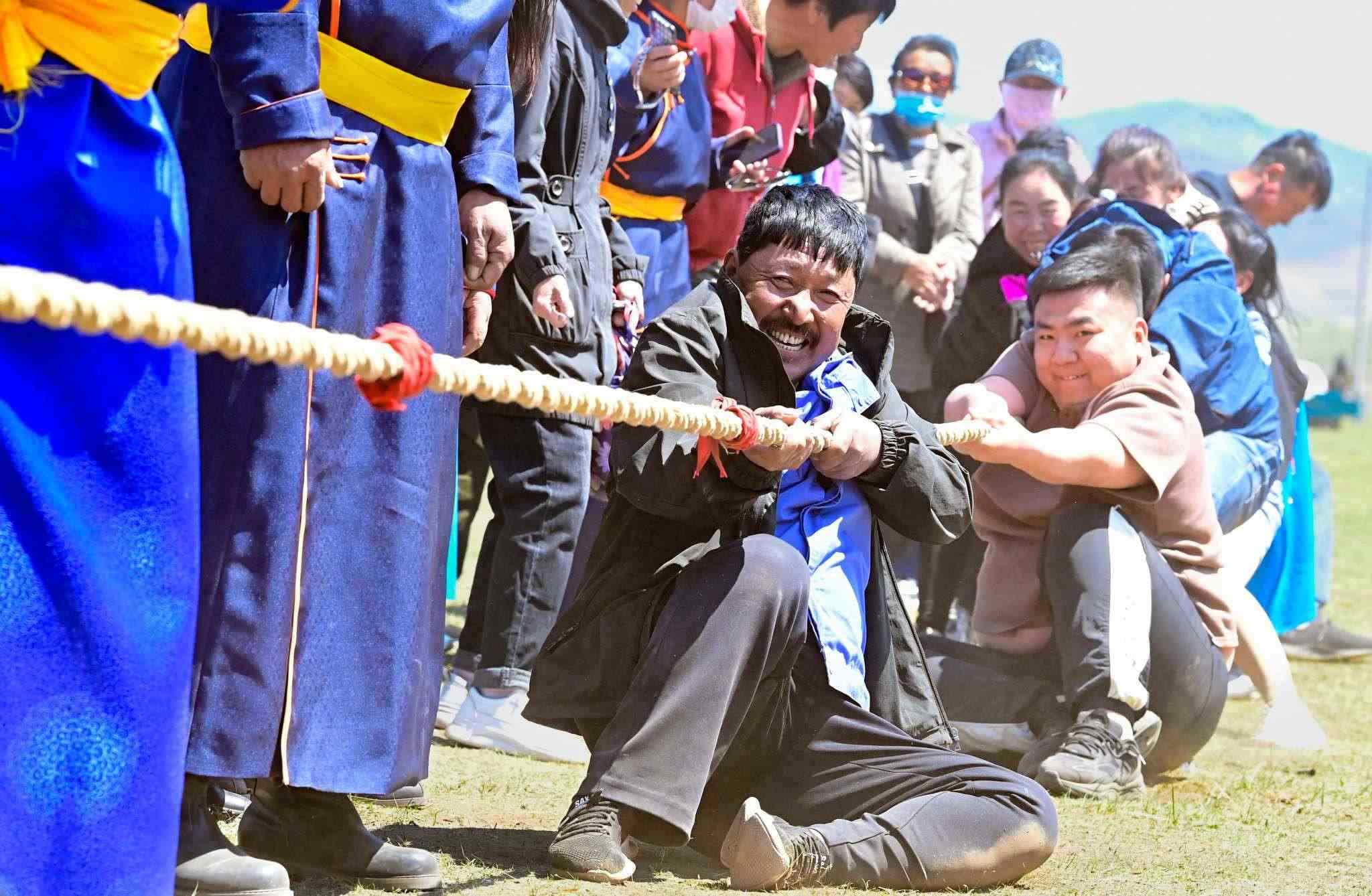 2023年5月26日,內(nèi)蒙古興安盟,科爾沁右翼前旗德伯斯鎮(zhèn)阿日林一合嘎查舉行首屆那達慕,設(shè)置的賽馬、布魯、搏克、拔河等傳統(tǒng)體育娛樂項目,吸引嘎查周邊500余名牧民參加比賽,喜慶牧業(yè)豐收季。視覺中國