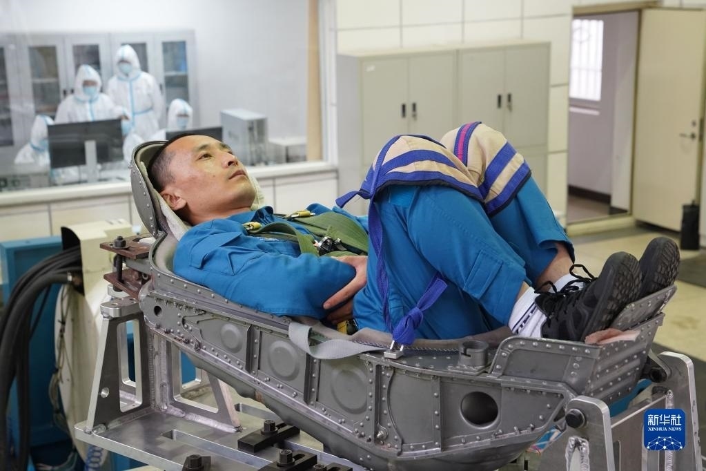 神舟十六號航天員朱楊柱在進行振動體驗(2022年4月27日攝)。新華社發(fā)(王夏陽 攝)
