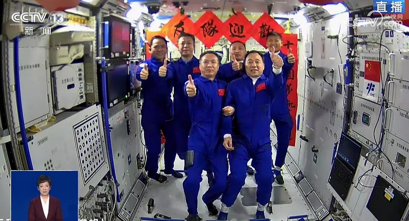 央視網(wǎng)消息:宇宙星河浪漫,探索永不止步。今天(5月30日)9時31分,搭載神舟十六號載人飛船的長征二號F遙十六運載火箭在酒泉衛(wèi)星發(fā)射中心點火發(fā)射,發(fā)射任務(wù)取得圓滿成功。神舟十六號航天員景海鵬、朱楊柱、桂海潮順利進(jìn)入太空。神舟十六號載人飛船入軌后,在16時29分成功對接于空間站天和核心艙徑向端口。之后,神舟十六號航天員乘組從飛船返回艙進(jìn)入軌道艙。翹盼已久的神舟十五號航天員乘組打開“家門”,歡迎遠(yuǎn)道而來的神舟十六號航天員乘組入駐“天宮”。