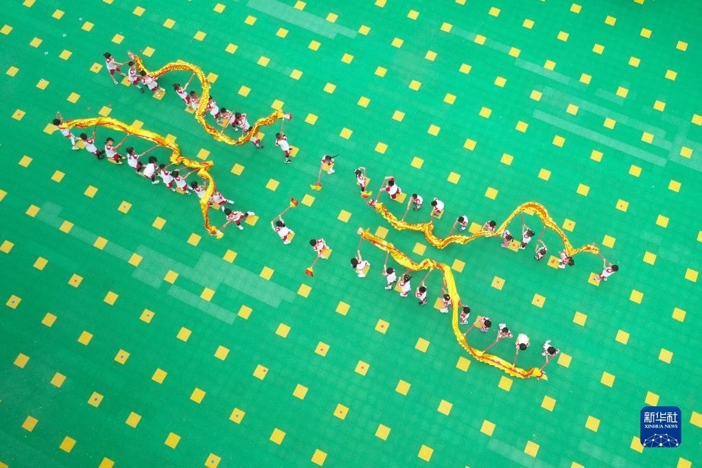 5月30日,在河北省唐山市豐潤區(qū)左家塢鎮(zhèn)中心幼兒園,孩子們在表演舞龍節(jié)目(無人機(jī)照片)。 新華社發(fā)(朱大勇攝)