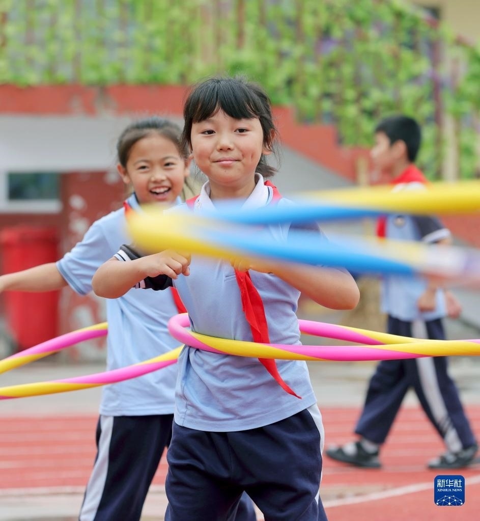 5月30日,河北省邢臺市廣宗縣第六小學(xué)學(xué)生在參加呼啦圈游戲。 新華社發(fā)(王壘攝)