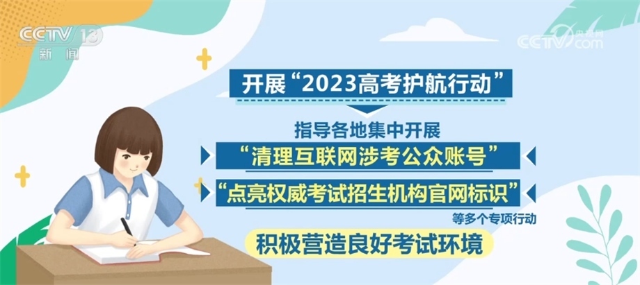 此外,將繼續(xù)開(kāi)展“2023高考護(hù)航行動(dòng)”,指導(dǎo)各地集中開(kāi)展“清理互聯(lián)網(wǎng)涉考公眾賬號(hào)”“點(diǎn)亮權(quán)威考試招生機(jī)構(gòu)官網(wǎng)標(biāo)識(shí)”等多個(gè)專(zhuān)項(xiàng)行動(dòng),積極營(yíng)造良好考試環(huán)境。